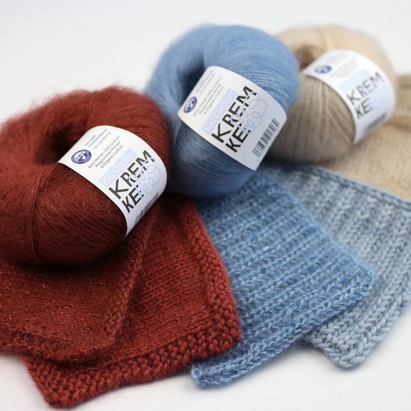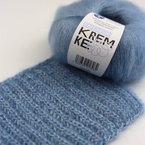 Kremke Kid Cotton to nowatorskie połączenie moheru i bawełny organicznej. Daje lekką dzianinę z charakterystycznym puszystym halo, ale z inną „strukturą” niż moher‑jedwab.